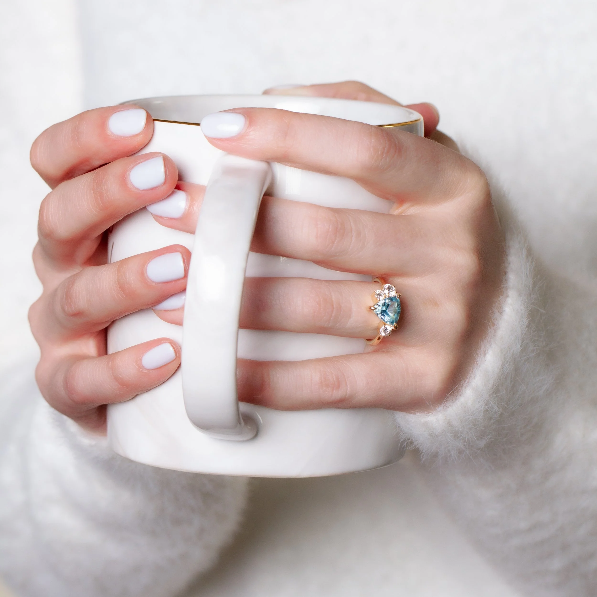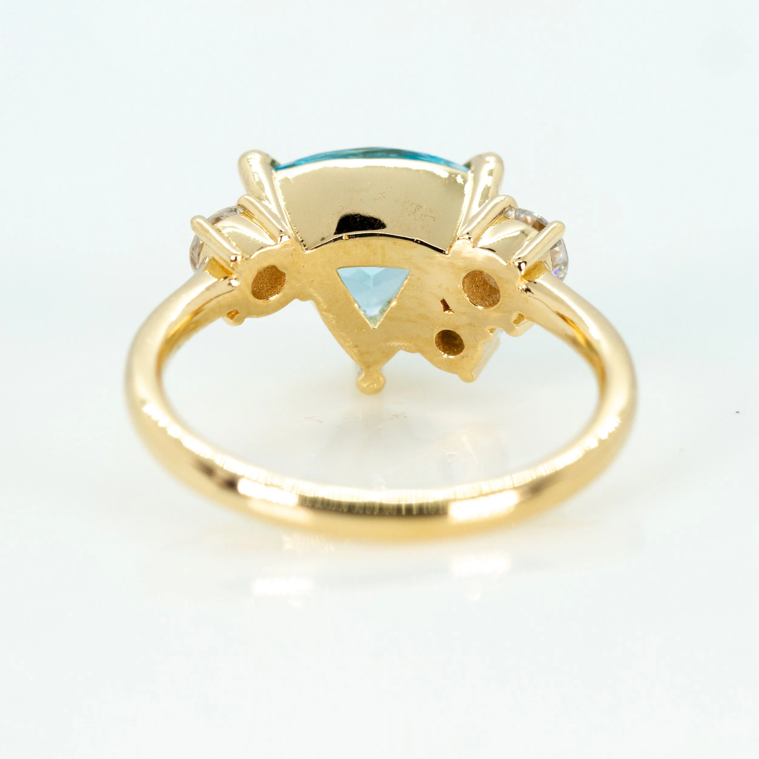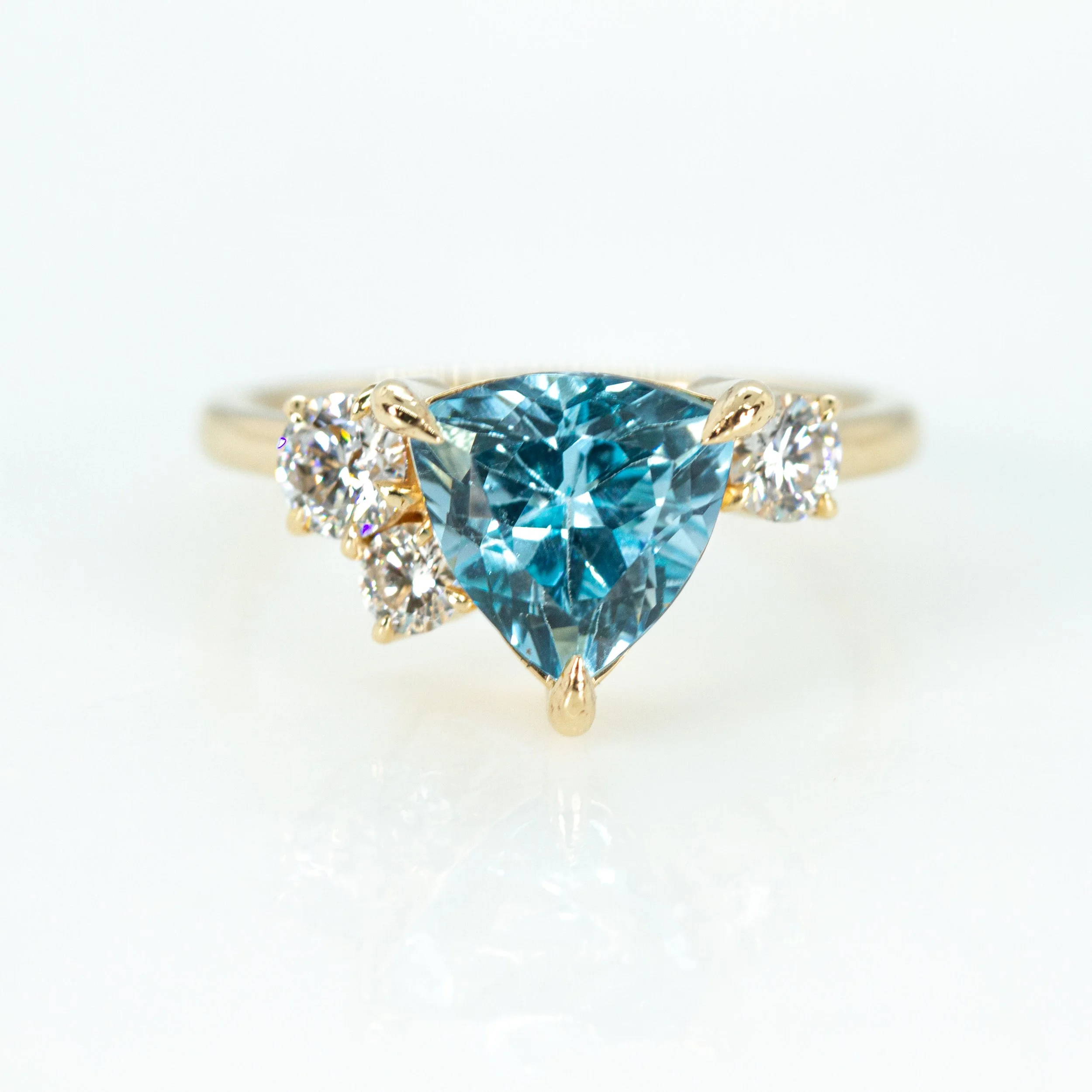 Custom designed, just for you.Custom designed jewelry made just for you, right here in Denver, CO. Custom triangle Blue Topaz cluster engagement ring with natural diamonds set in 14KT Yellow Gold